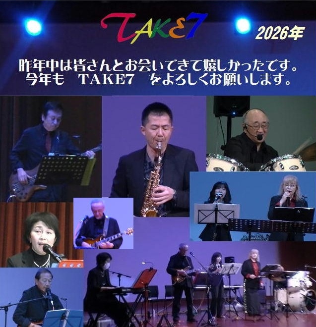 10月8日(日)午後、緑が丘グリンパルで行われる「緑が丘スポーツクラブ交流の集い」のアトラクションでTAKE7が演奏します、観覧は自由なので、私たちの音楽を聴いて元気になりたい方はぜひお越しください。時間帯等の細かい日程は決まり次第お知らせします。