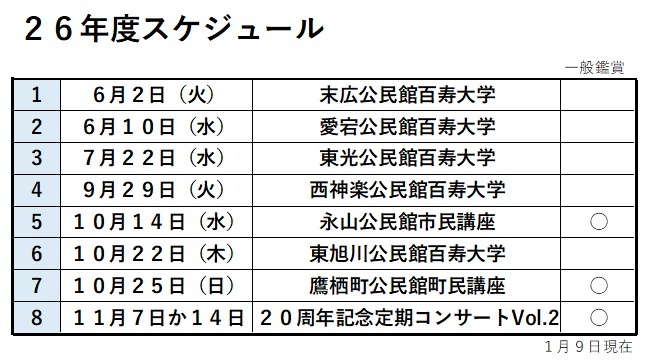 10月11日(水)今年で6回目になります永山公民館主催市民講座コンサートが開催されます。市民講座会員の方以外にも、一般公開として12名の参加が可能です。ご希望の方は永山公民館にお申し込みください。20日から受け付けているそうです。☎48-1659