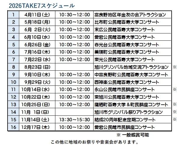 永山公民会主催の市民講座は会員の講座ですが、TAKE7のコンサートに限り、一般公開をしています。ただ人数に限りがありますので、永山公民館に電話で申込みをしてください。